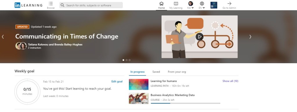 When a learner logins into LinkedIn Learning and arrives on the home page they will see the following