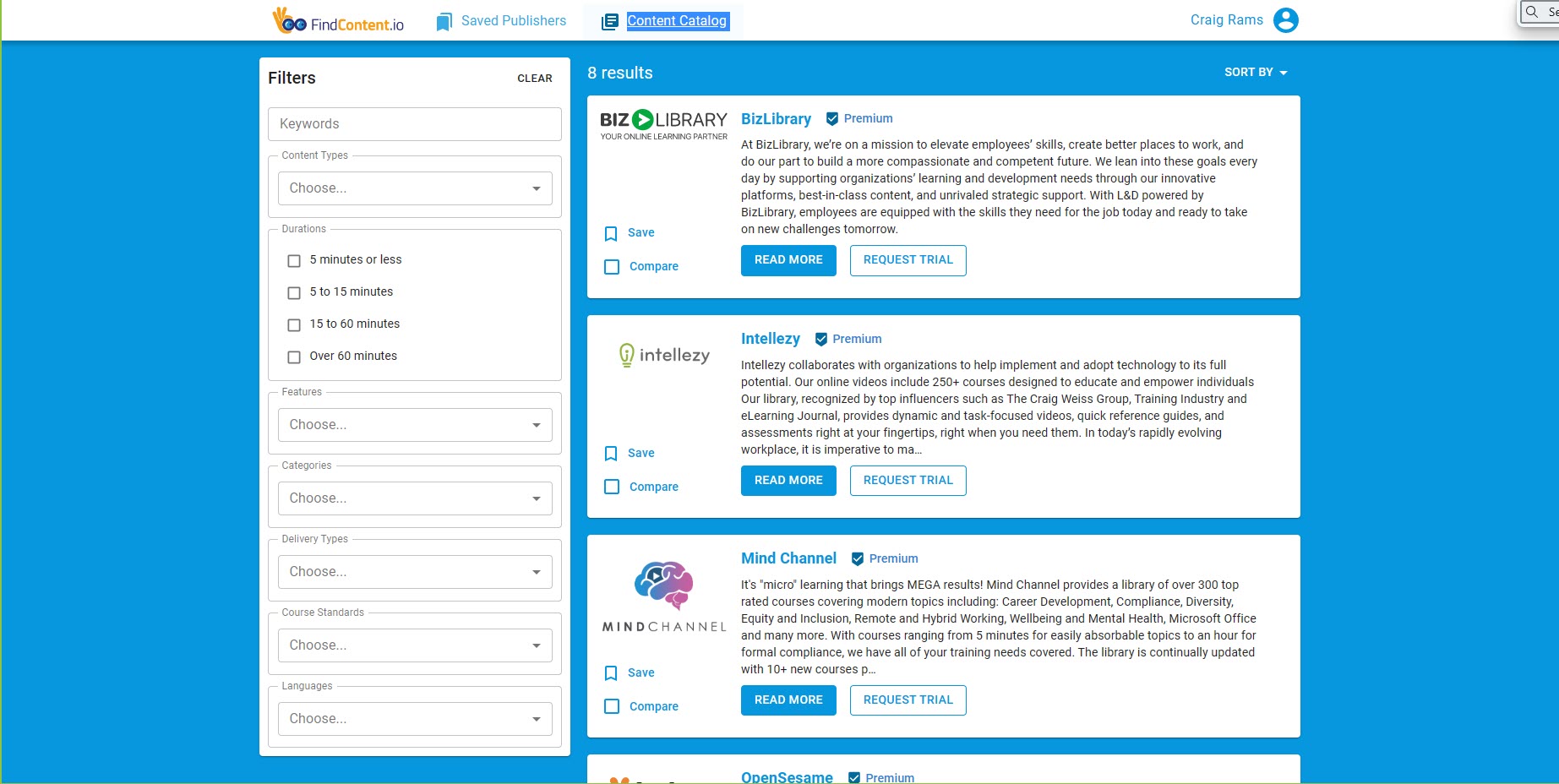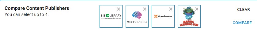 A: Great question. FindContent.io is a platform that combines detailed information around a publisher/off-the shelf provider (3rd party content), with the ability to access courses/content from a variety of vendors, that you can use as much as you want and as often as you want. Some of the courses are trials or limited, but the majority are full access – and will be constantly updated by the vendors. You can save content providers in your home screen to consider later on, you can compare them – up to four at one time, you can use filters to define and identify, and you can see a lot of information on them. Thus FindContent.io are two platforms in one. Something that has never been done before in the 3rd party, off-the-shelf content/courses industry.