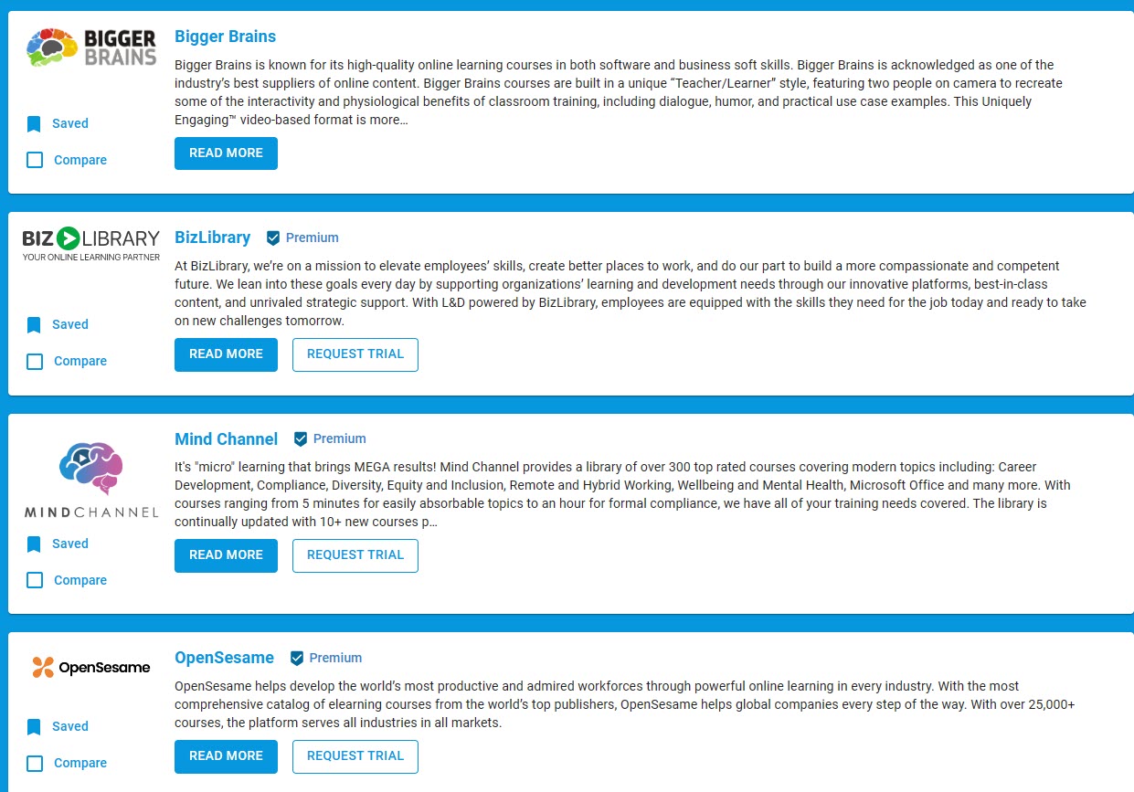 - People today like to compare X to Y, and the platform provides that – it is a great tool; otherwise, you have no idea when you find the content/courses on the net, and thus, require an RFP to do – a time-consuming experience.