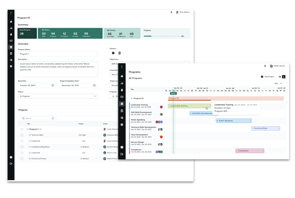 - Programs – Screenshot below – again, a component of project management – they refer to them as programs overall, then projects – you can see how many you have, the status, progress, and by priority. You can create your own name for the program, description, what projects are tied to said program, what are the objectives, and who owns what.