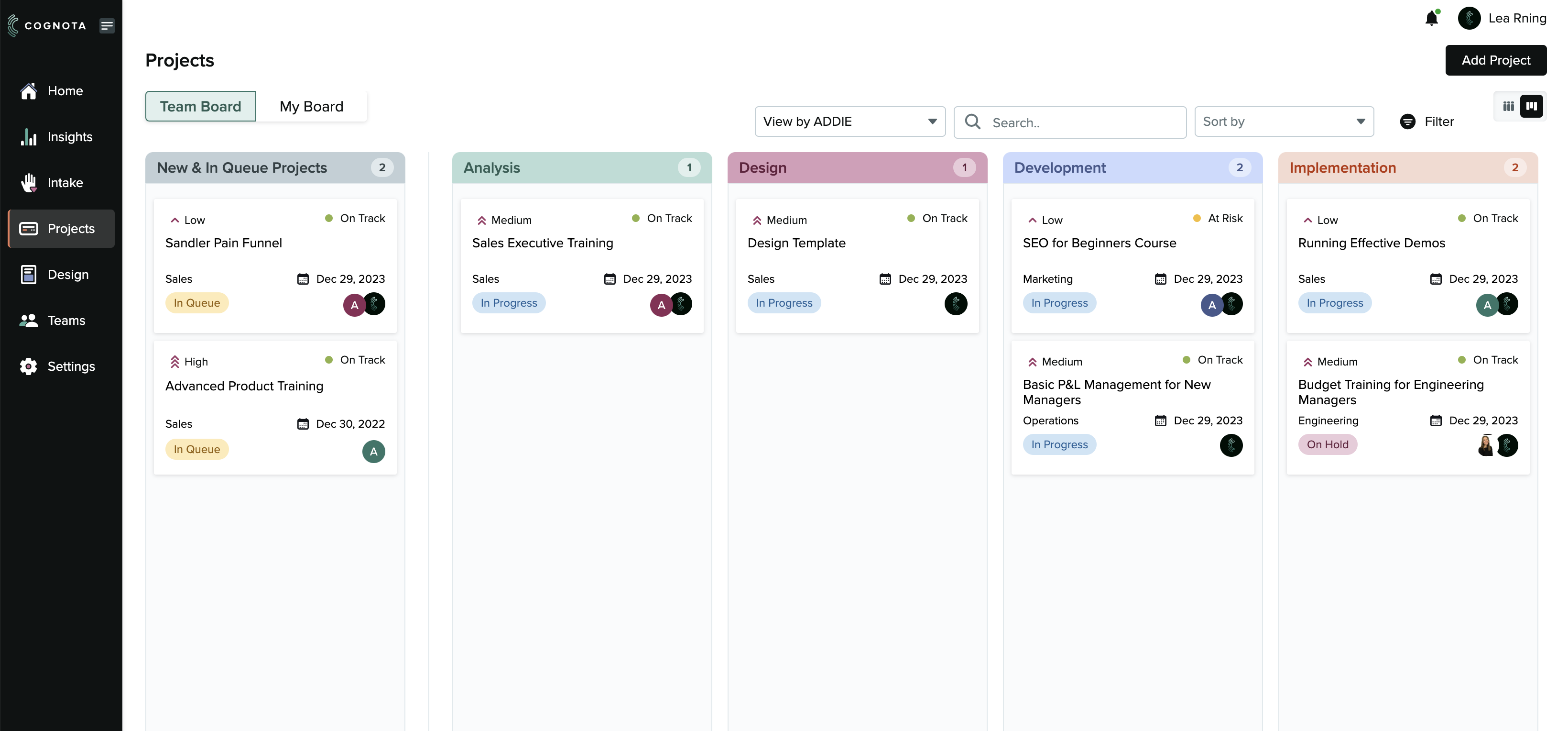 - Project Board – Reminds me of Trellio (a product I liked), and again adds clarity – it is a nice twist to the way of folks who have project mgt components in their learning systems, that look frankly, awful. Cognota definitely does not.
