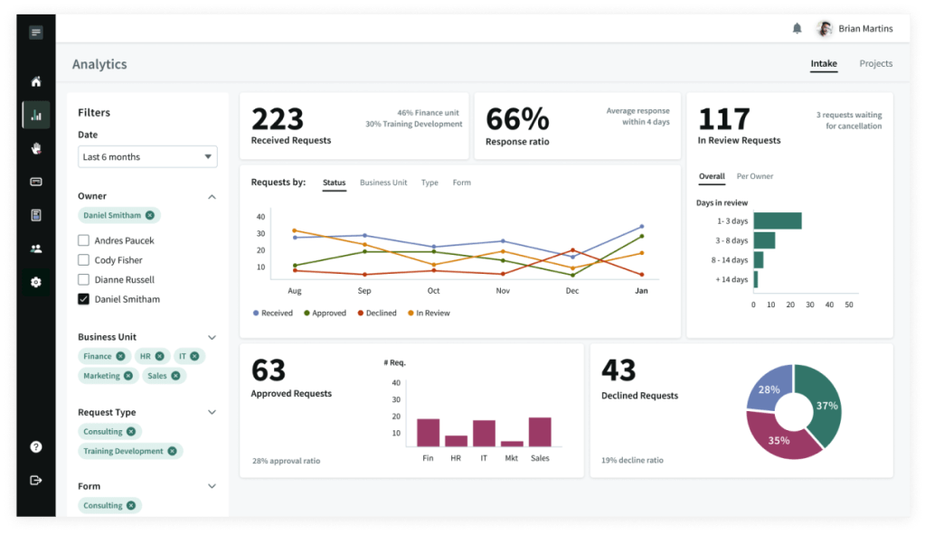 This screen shows the request type, business unit, who owns what, status – all filters btw. You can see what requests were approved or declined, in-review, response ratio (another win) and requests by. I did wish the requests by graphic was a bit clearer, as trend lines such as these, can be confusing to some folks. Of course, this screen changes based on the filters you select. In the above screen, it is showing by “intake”. You can switch to “Projects,” too.