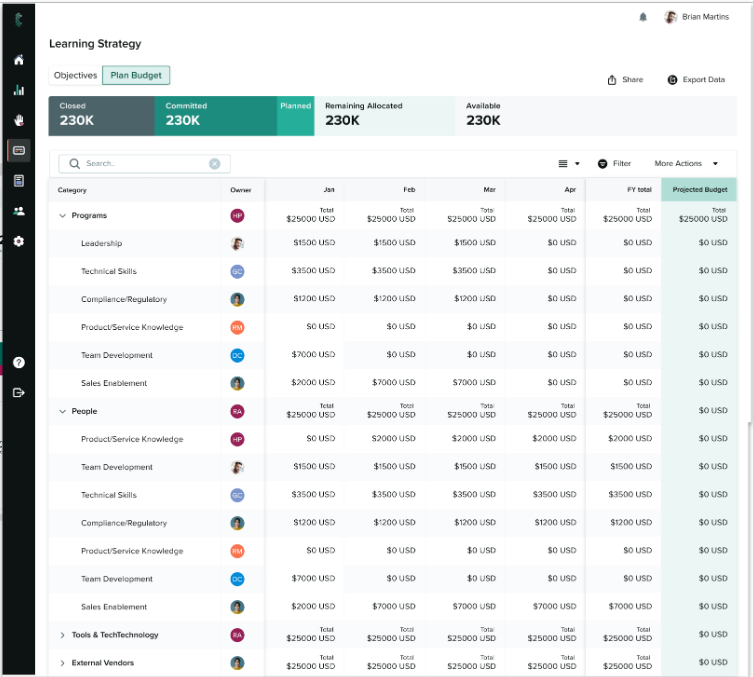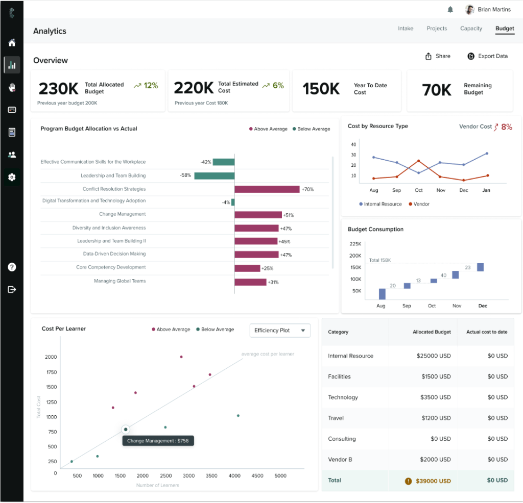 The above screen is another tied around budget. This time for learning strategy and the costs for each. Again, I like this – but I can see how it would be convoluted, confusing and cumbersome for some folks. There is too much on one screen. I’d prefer picking a program or a few, and seeing that with that specific data OR go into cost per learner around each program. This is far different than what appears above.