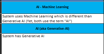 Hence the two options under AI. Don’t be surprised if a vendor is using both. Why? Token fees! Pricey to the vendor, so how do I as a vendor resolve that? Some parts are Gen-AI, and other items are machine learning.