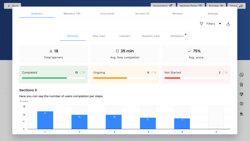 What I love in this metric screen, is where it says “number of users completion per step.” Let’s say you are doing chapters in a course. Wouldn”t you want to know how many people completed that chapter, especially if you are rumbling around with a channel or cohort? Validations is another metric I liked.
